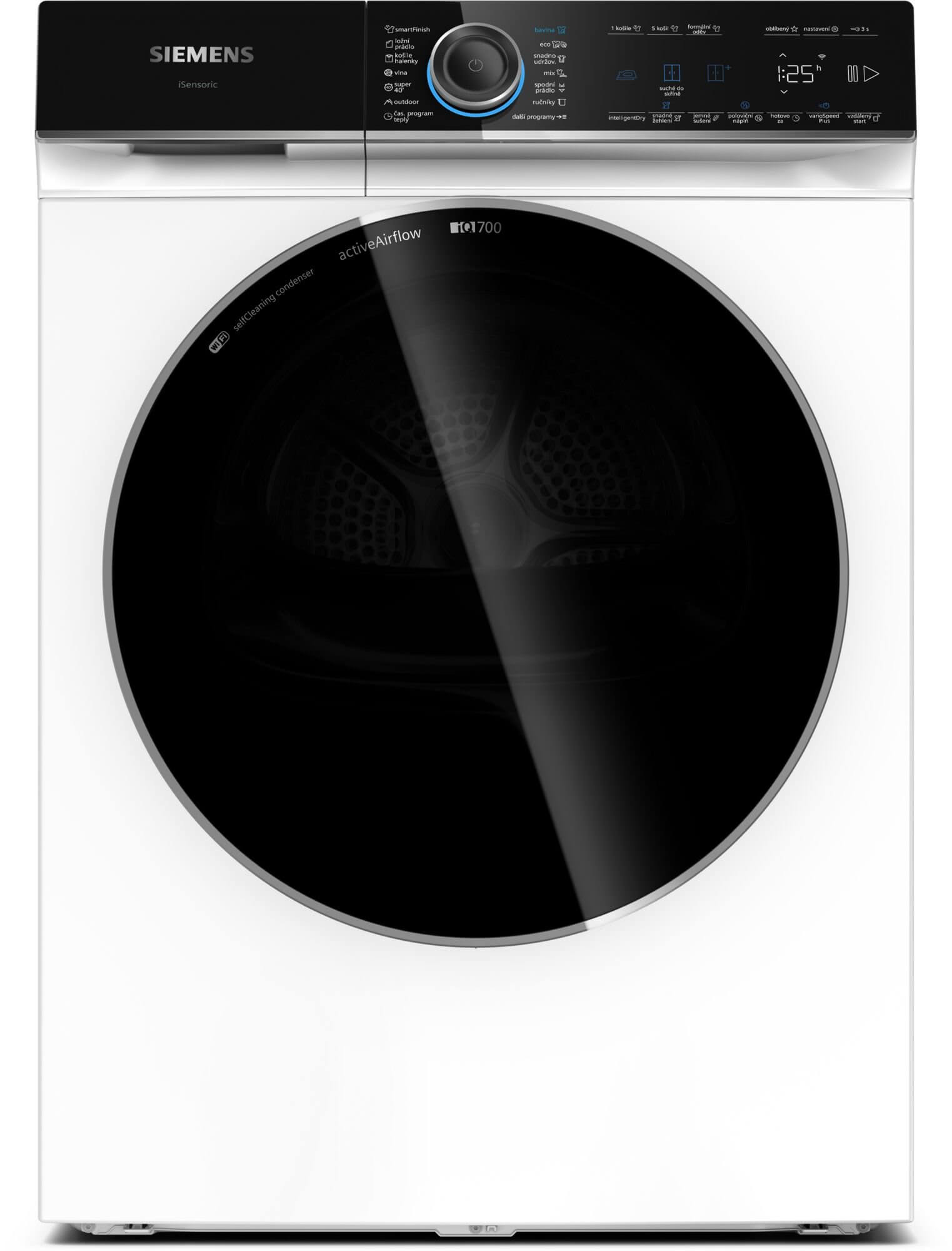 touchControl tlačítka: 1 košile, 5 košil, základní nastavení, suché k žehlení, formální oděv, suché do skříně, extra suché do skříně, nastavení konce sušení, poloviční náplň, dětská pojistka, ochrana proti zmačkání, oblíbený, tlačítko power, vzdálený start, šetrný, intelligentDry, start/reload/pauza, VarioSpeed, odložení startu až o 24 hod.
